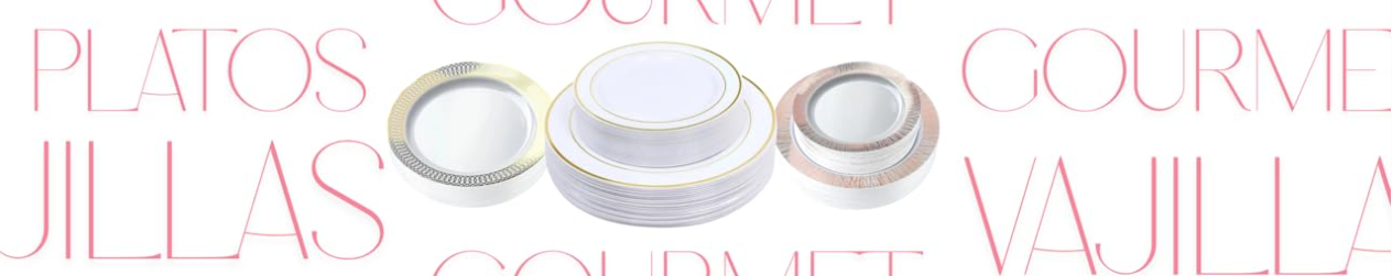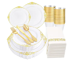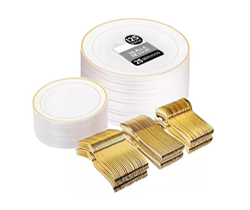 Set de Vajilla Elegante de Plástico Rígido con borde Dorado de Alta Calidad para 25 Personas.