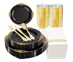 Set de Vajilla Fina para Fiesta de color Negro con grabado color Oro 175 Pz.